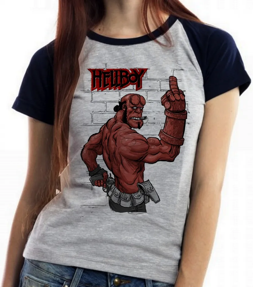 Baby look blusa feminina Hellboy dedo do meio parede Imagem