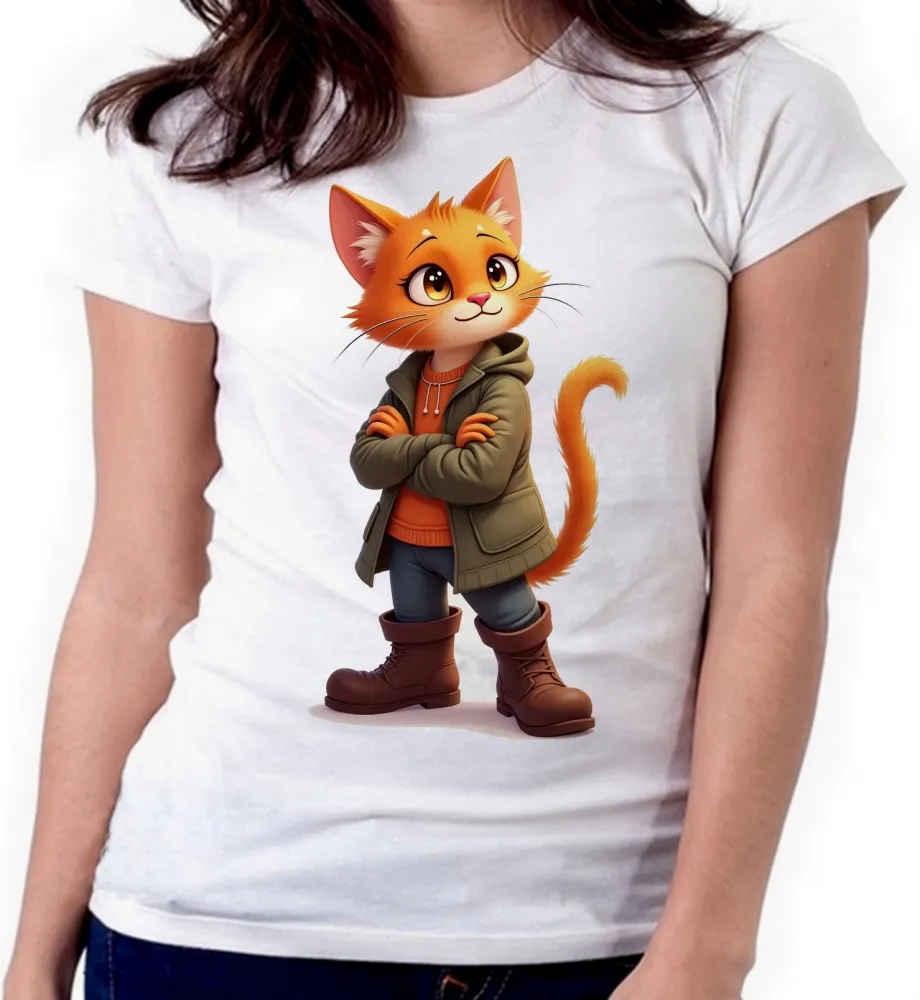Baby look blusa feminina ou Camiseta Gato de botas colorido