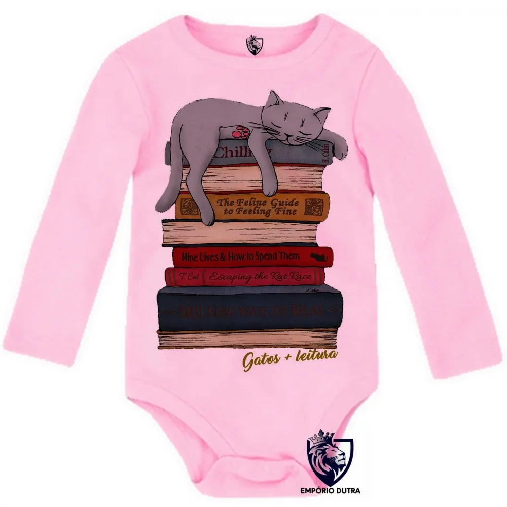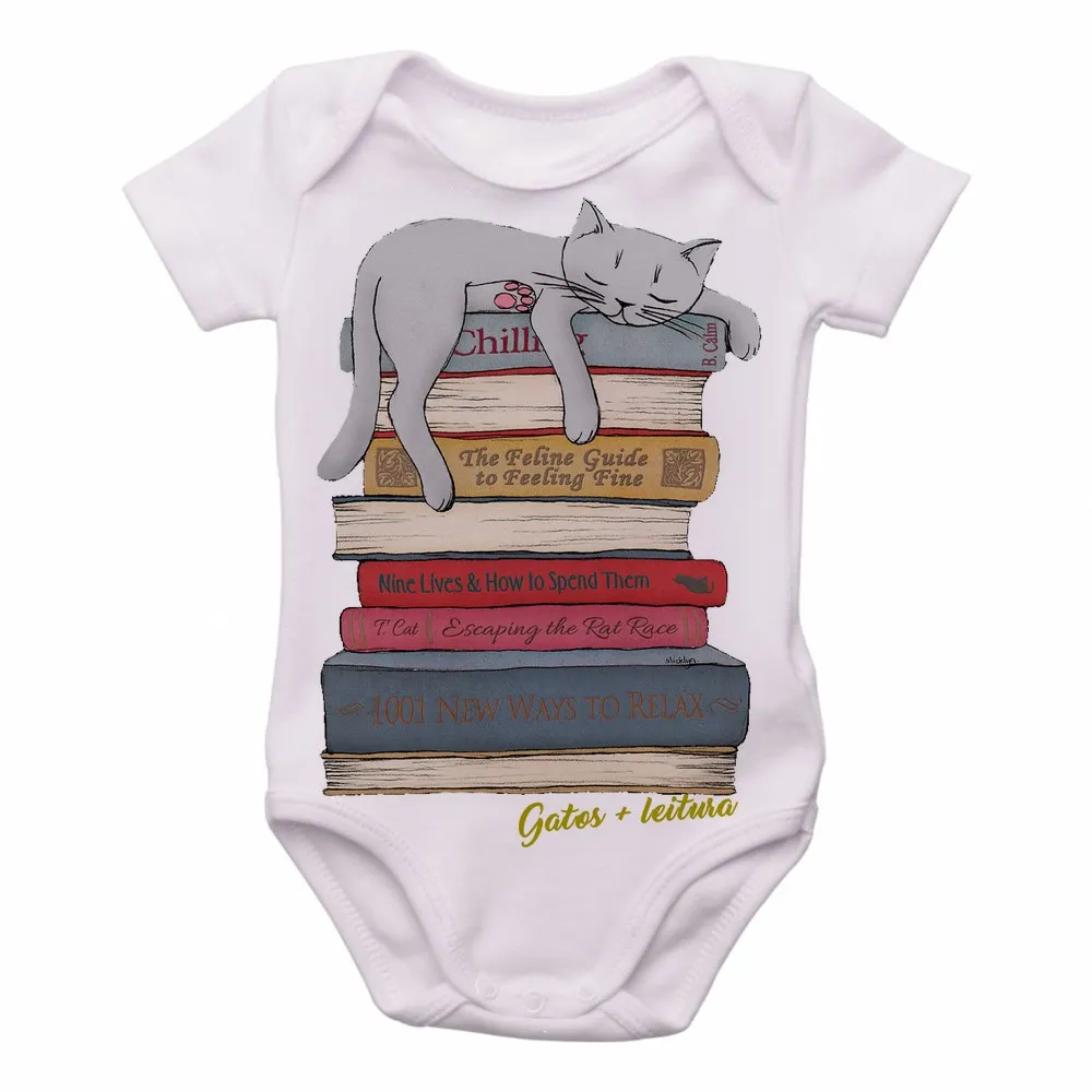 Body Bebê Infantil Gatos leitura pilha livros cat