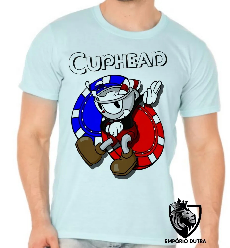 Camiseta adulto ou infantil Cuphead azul vermelho jogo game