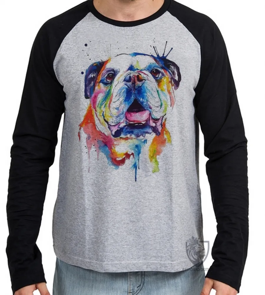 Camiseta manga longa Infantil ou Adulto cachorro bulldog Buldogue colorido