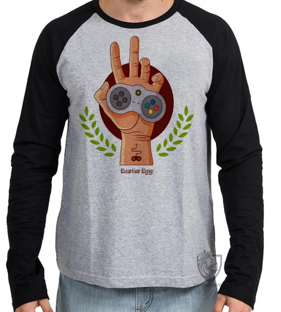 Camiseta manga longa Infantil ou Adulto Easter egg controle mão game nerd