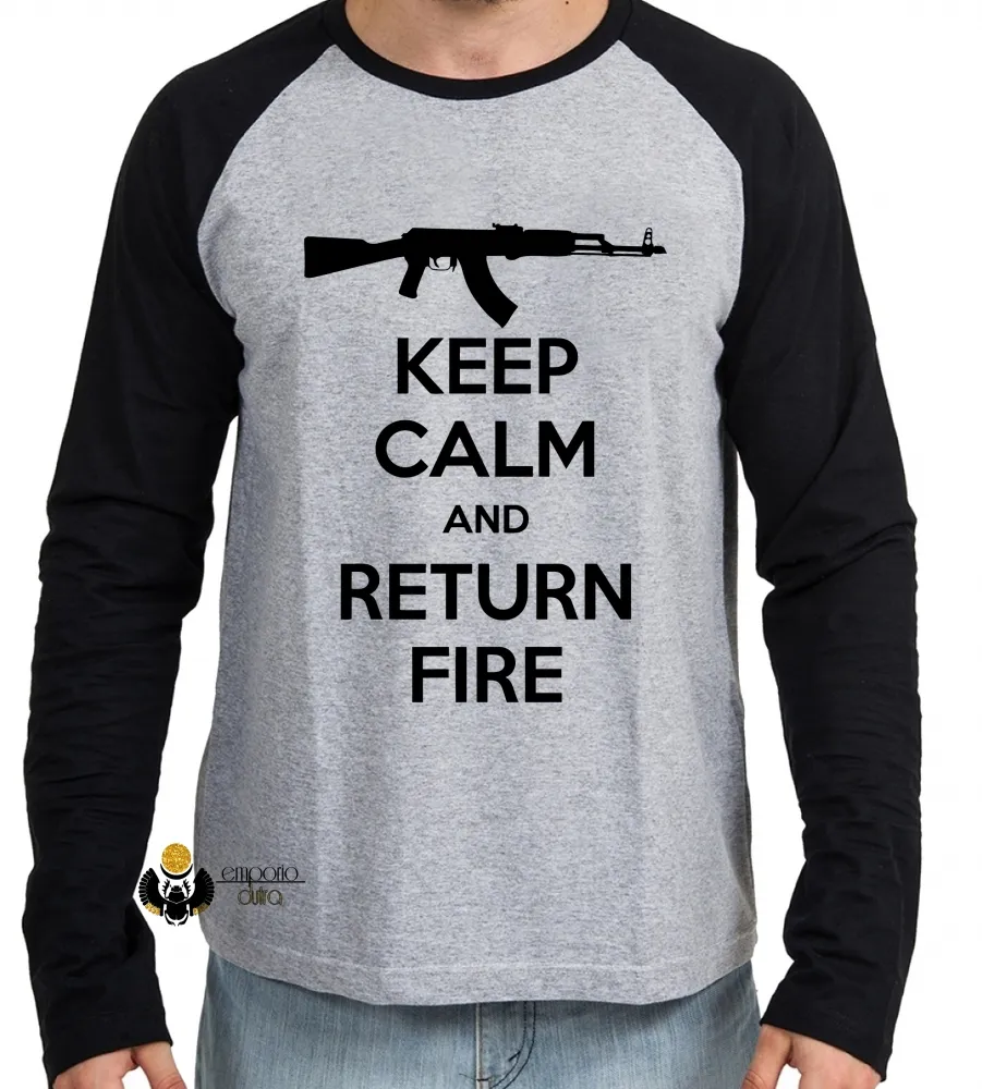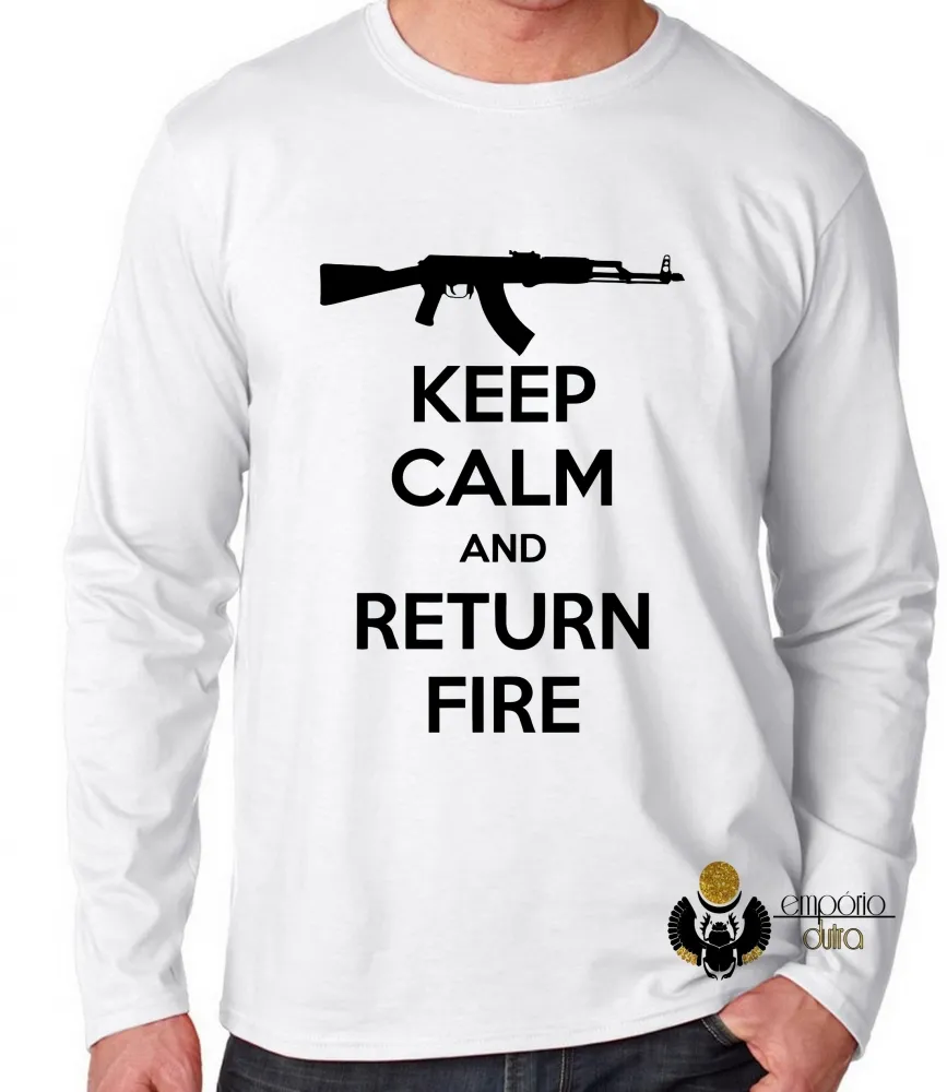 Camiseta manga longa Infantil ou Adulto Fuzil arma pistola ak 47 keep calm