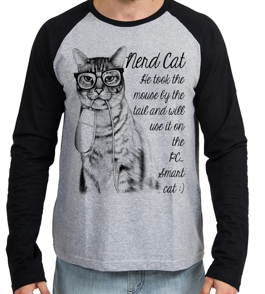 Camiseta manga longa Infantil ou Adulto Gato nerd mouse boca rato