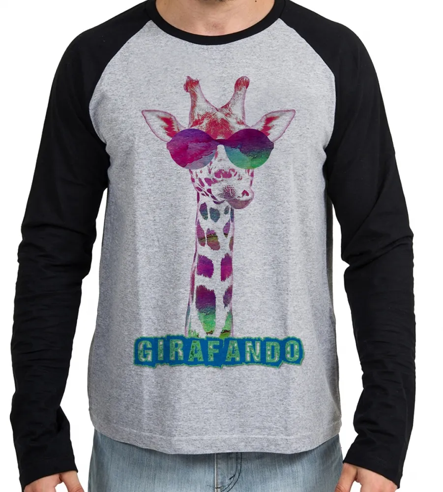 Camiseta manga longa Infantil ou Adulto Girafando girafa de óculos