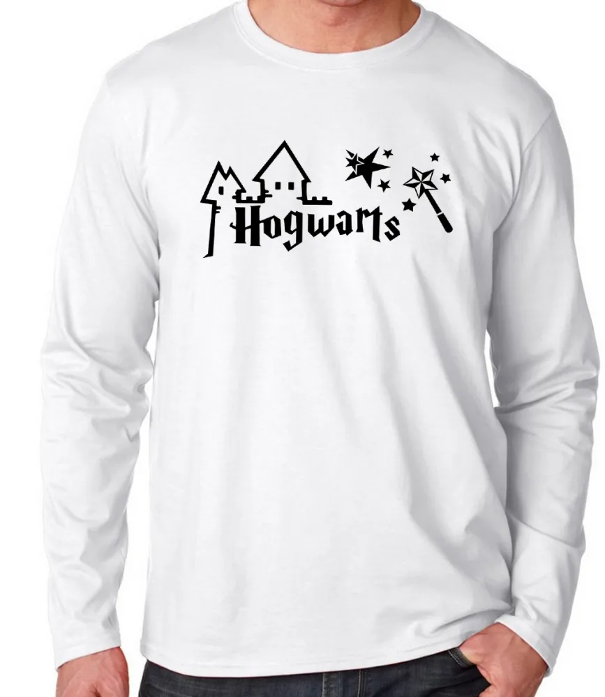 Camiseta manga longa Infantil ou Adulto Hogwarts harry potter varinha estrelas