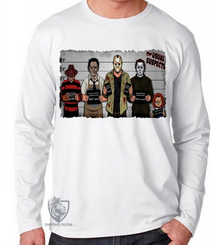 Camiseta manga longa Infantil ou Adulto jason chuck Freddy Krueger Massacre da Serra Elétrica Halloween vilões