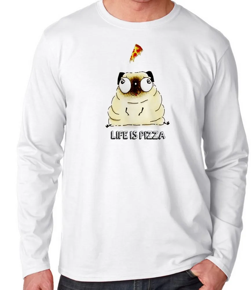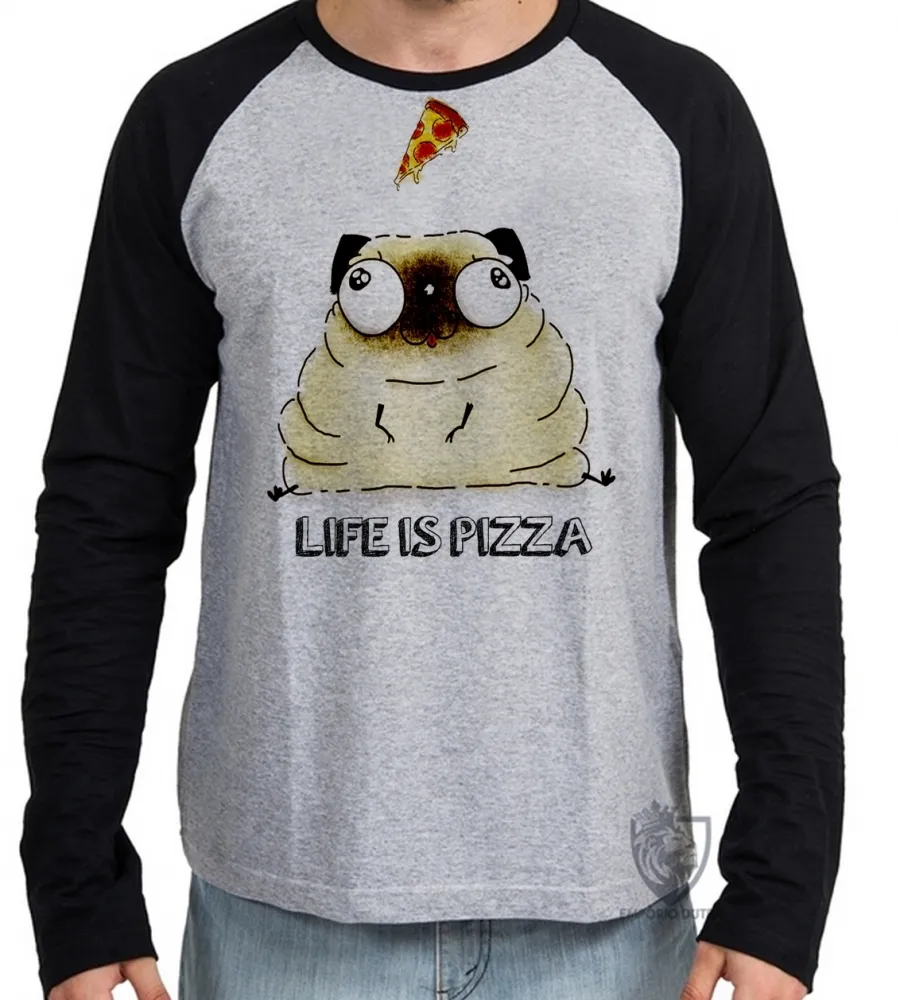 Camiseta manga longa Infantil ou Adulto Life is pizza pug dog cachorro cão