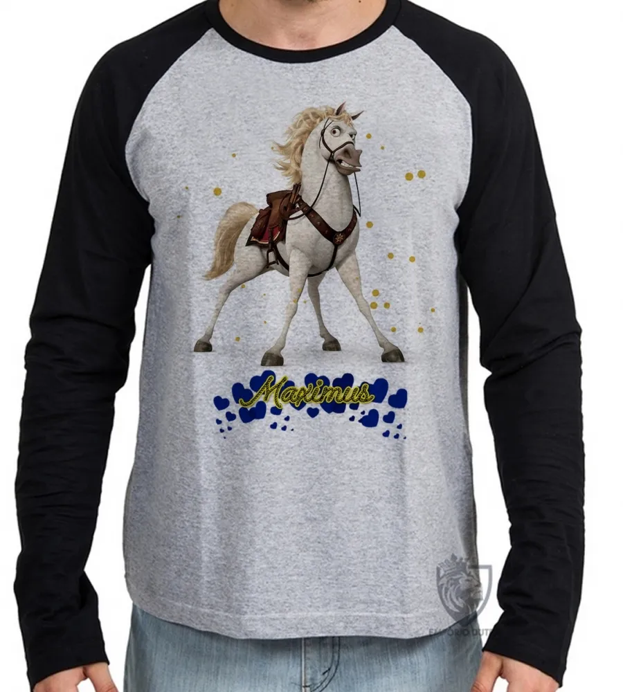 Camiseta manga longa Infantil ou Adulto Maximus corações rapunzel cavalo