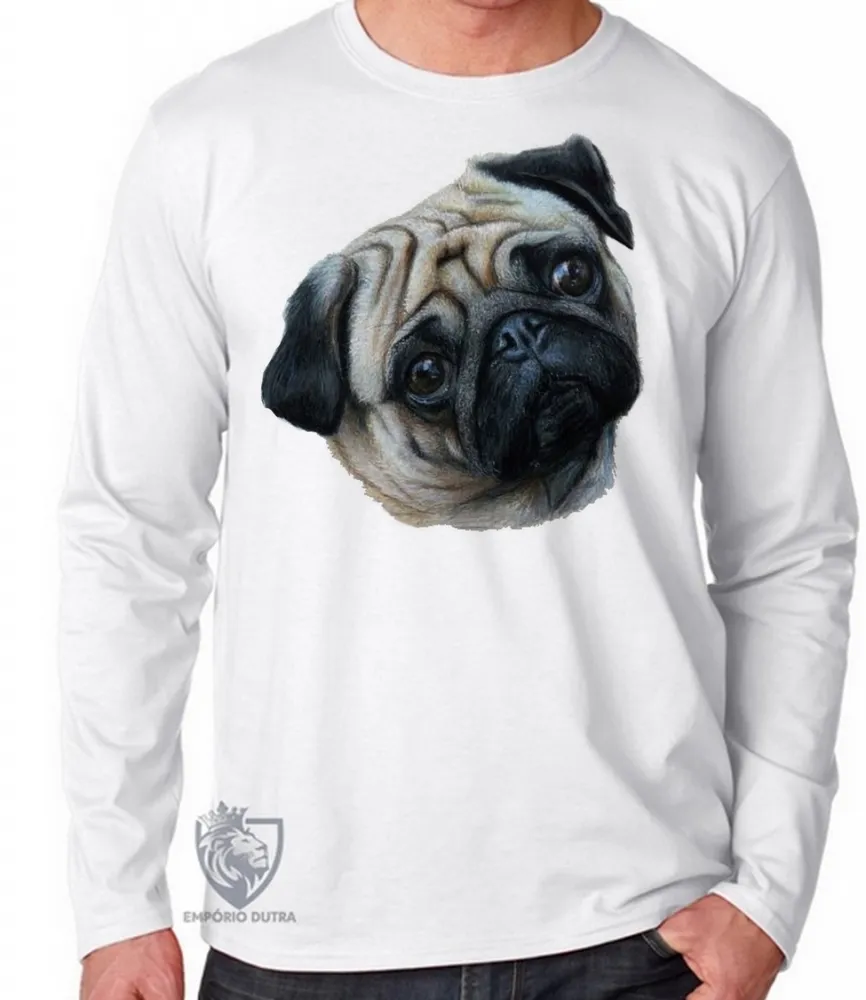 Camiseta manga longa Infantil ou Adulto cachorro cão dog pug raça canina