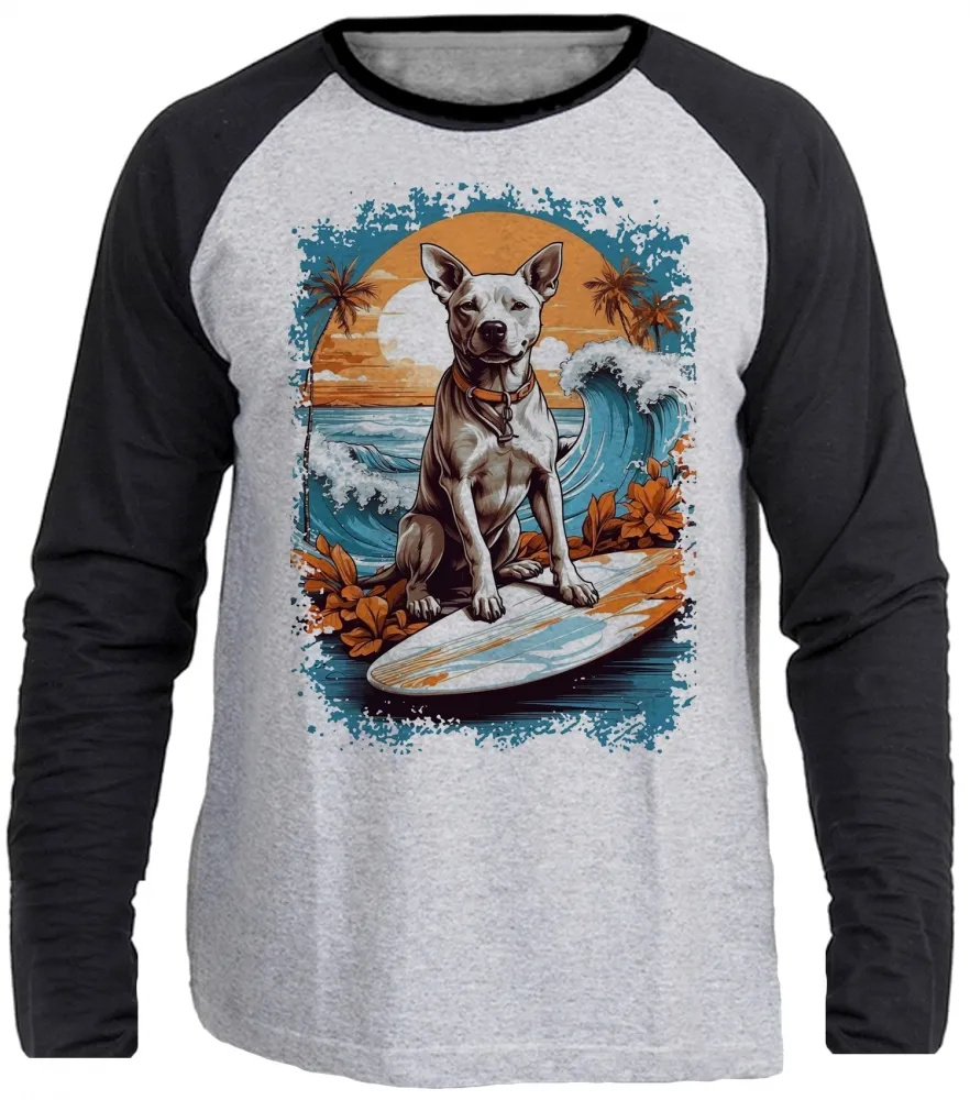Camiseta manga longa Infantil ou Adulto cachorro pit bull praia surf