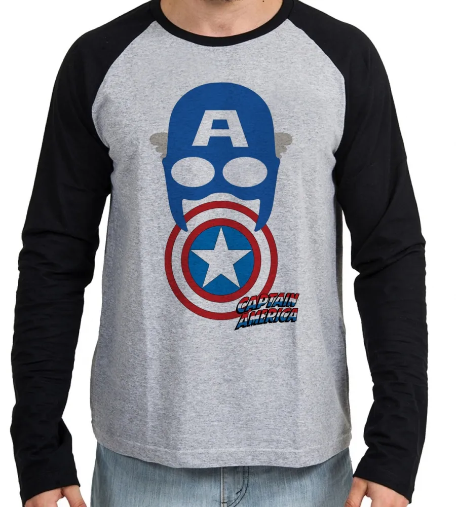 Camiseta manga longa Infantil ou Adulto Capitão América máscara escudo
