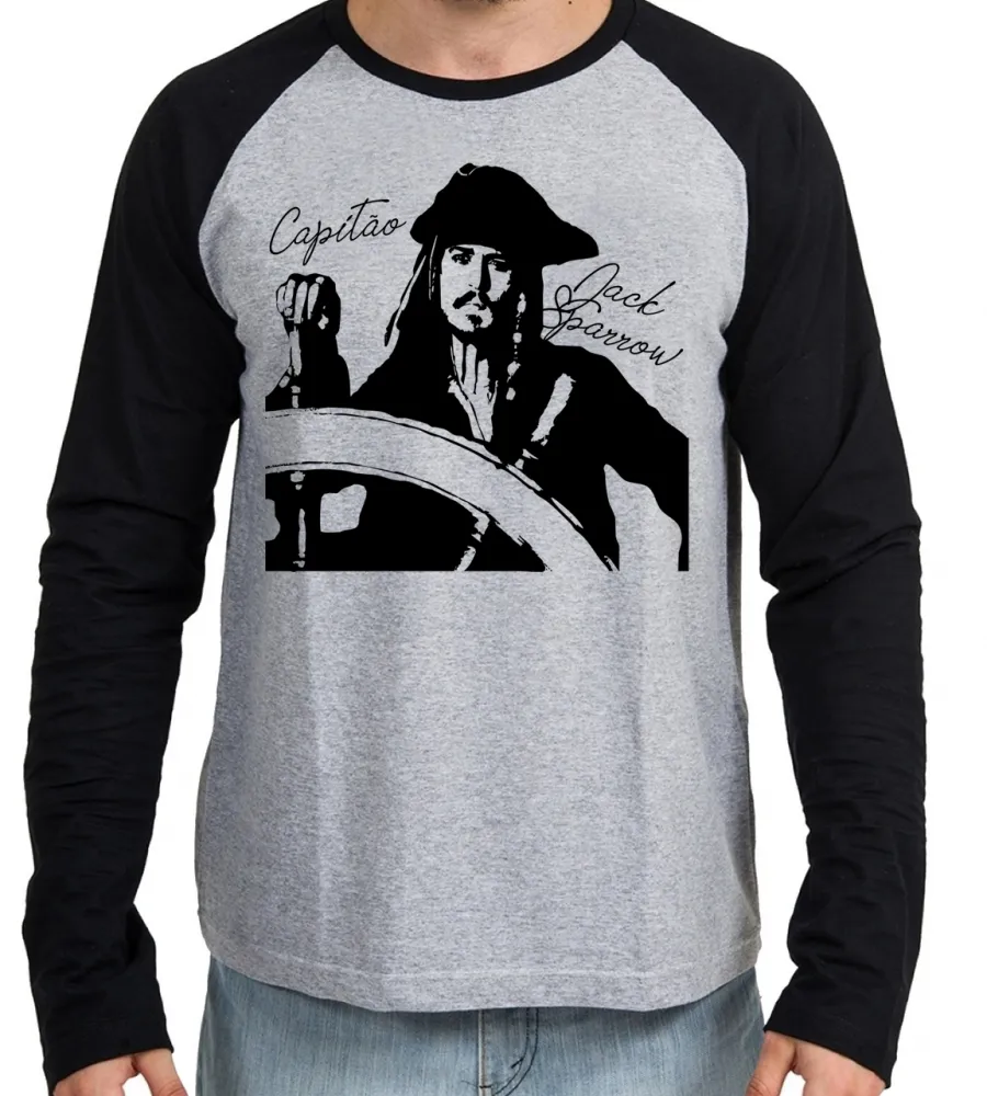 Camiseta manga longa Infantil ou Adulto Capitão Jack Sparrow pirata caribe