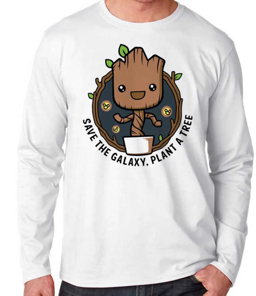 Camiseta manga longa Infantil ou Adulto Salve galáxia plante um groot árvore
