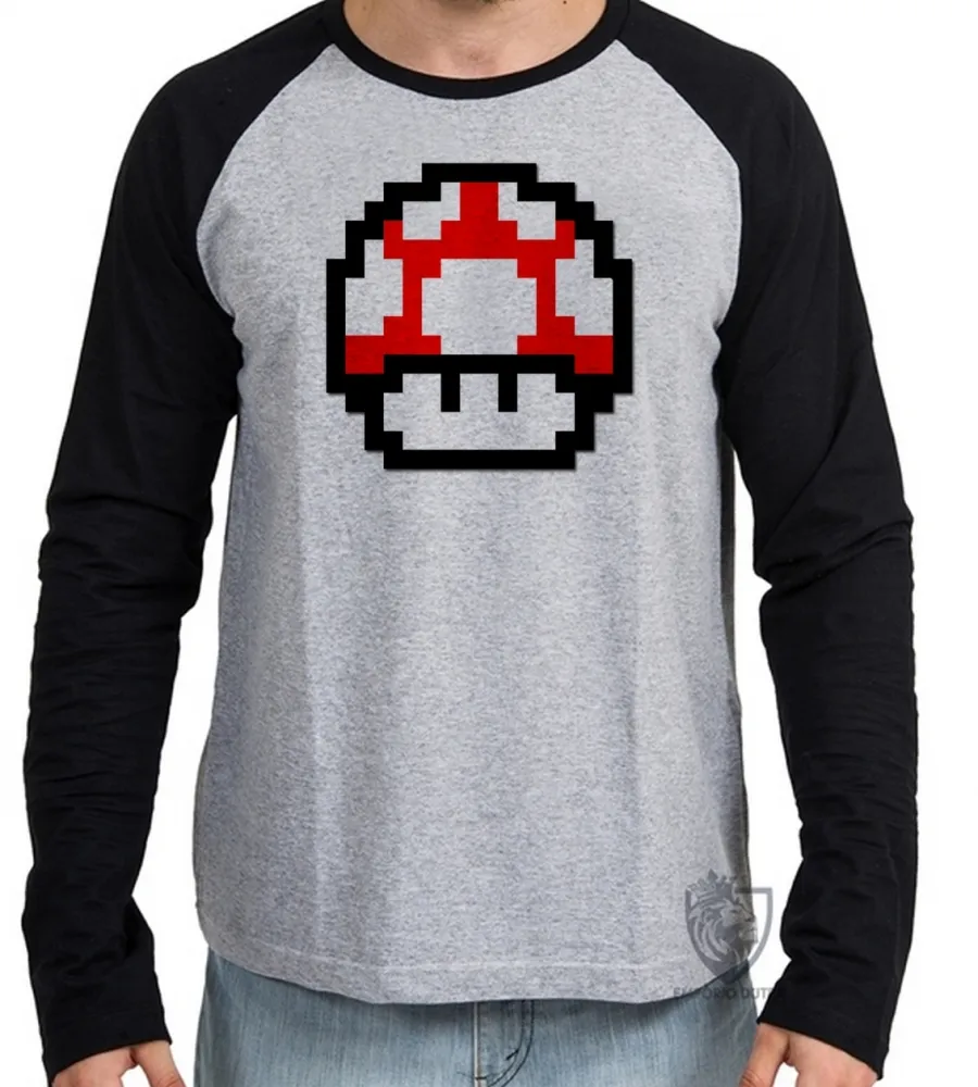 Camiseta manga longa Infantil ou Adulto Super Mario pixel cogumelo toad
