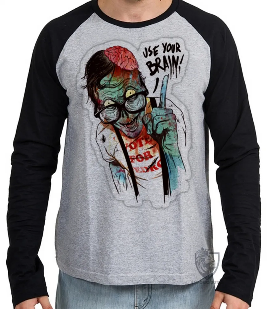 Camiseta manga longa Infantil ou Adulto Zombie use your brain cerebro caveira