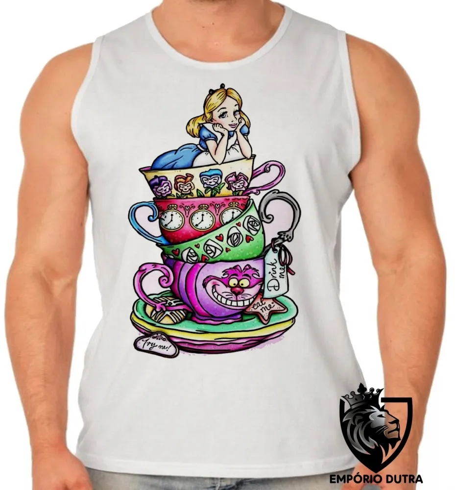 Camiseta Regata adulto ou infantil Alice e gato no pais das maravilhas